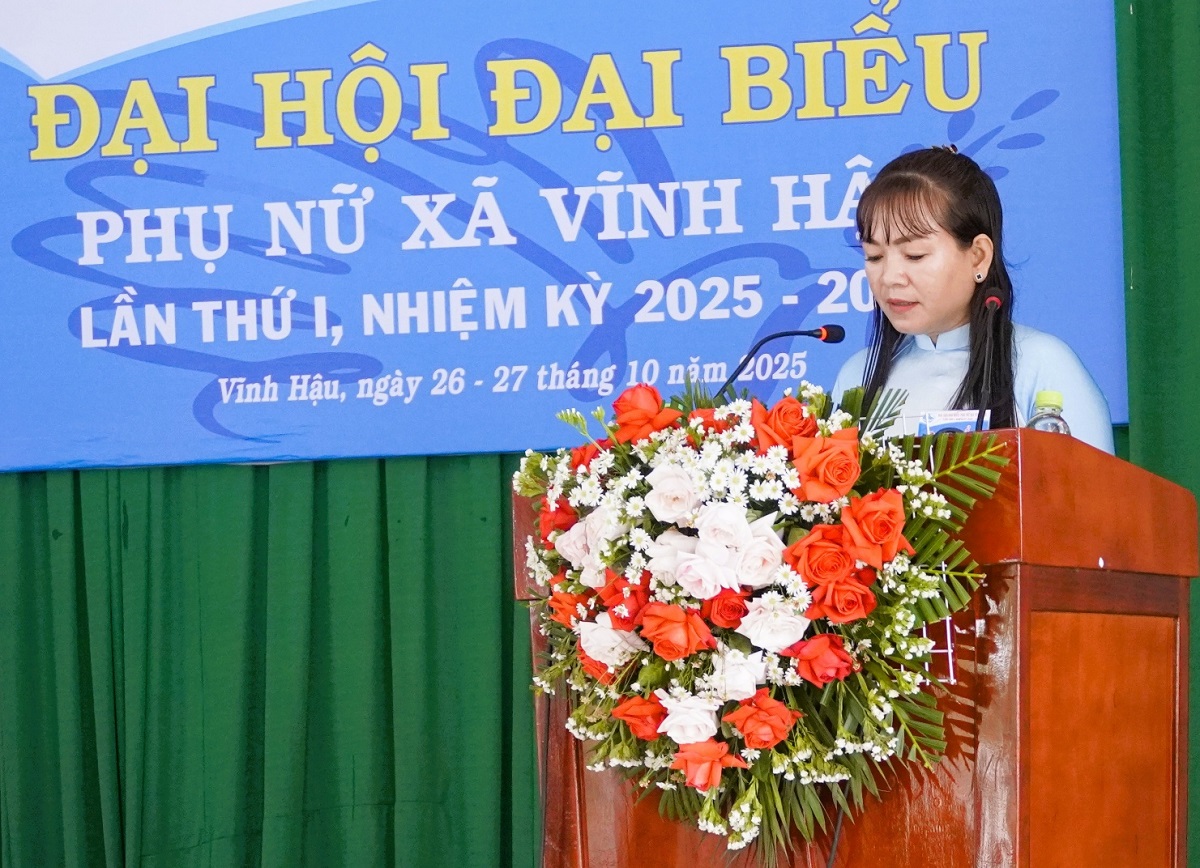 Ngày 27/10/2025, Hội Liên hiệp Phụ nữ xã Vĩnh Hậu tổ chức Đại hội đại biểu lần thứ I, nhiệm kỳ 2025 – 2030. Tham dự Đại hội có đồng chí Nguyễn Thị Quyến, Phó Chủ tịch Thường trực Hội Liên hiệp Phụ nữ tỉnh An Giang; đồng chí Nguyễn Thanh Việt, Phó Bí thư Thường trực Đảng ủy xã; các đồng chí trong Ban Thường vụ Đảng ủy xã; và 130 đại biểu chính thức, đại diện cho 7.289 hội viên phụ nữ toàn xã.