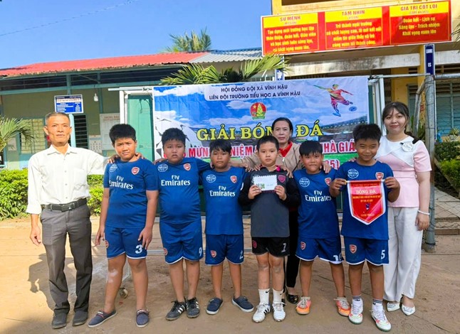 Trao giải cho đội bóng vô địch của Trường Tiểu học A Vĩnh Hậu