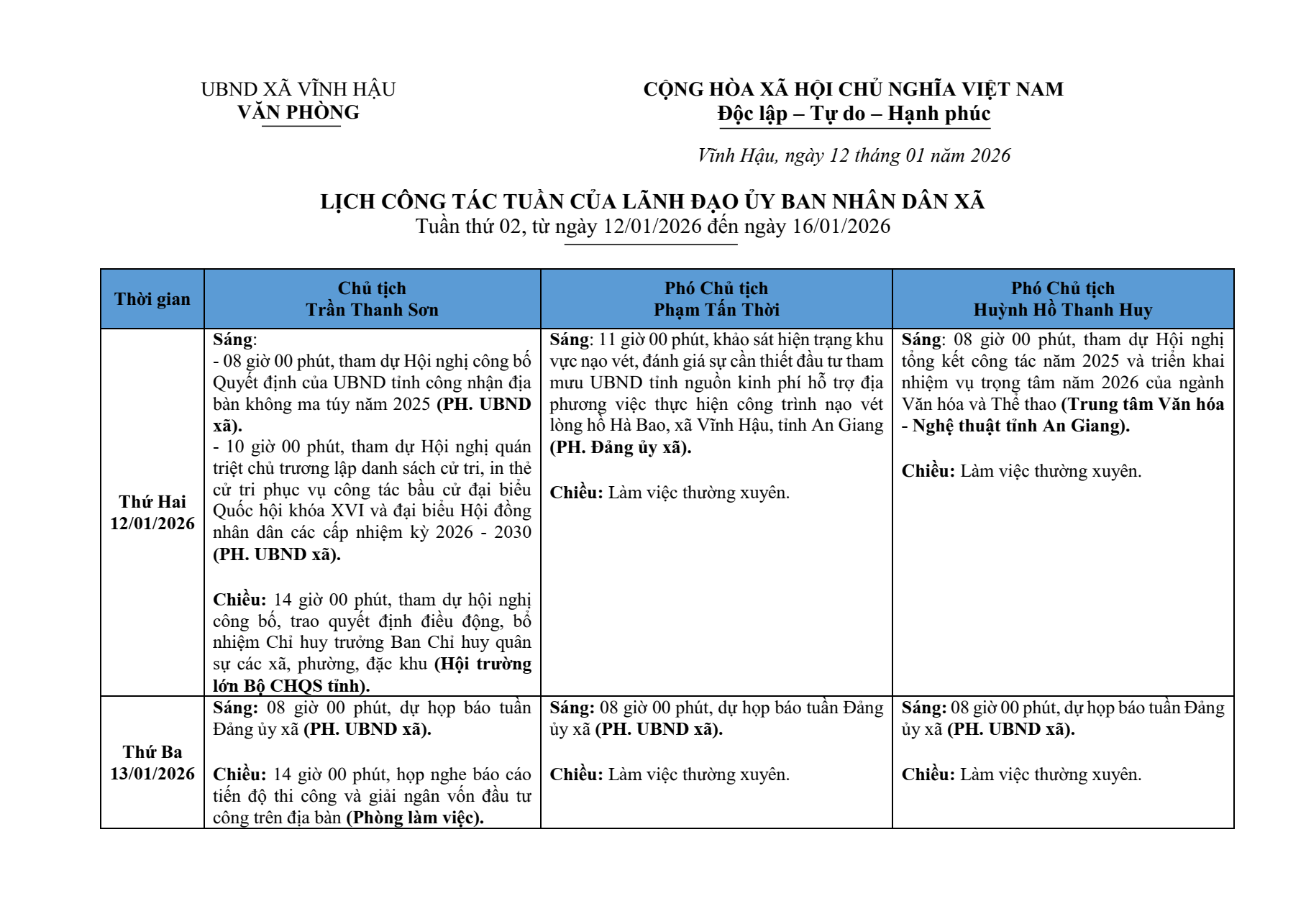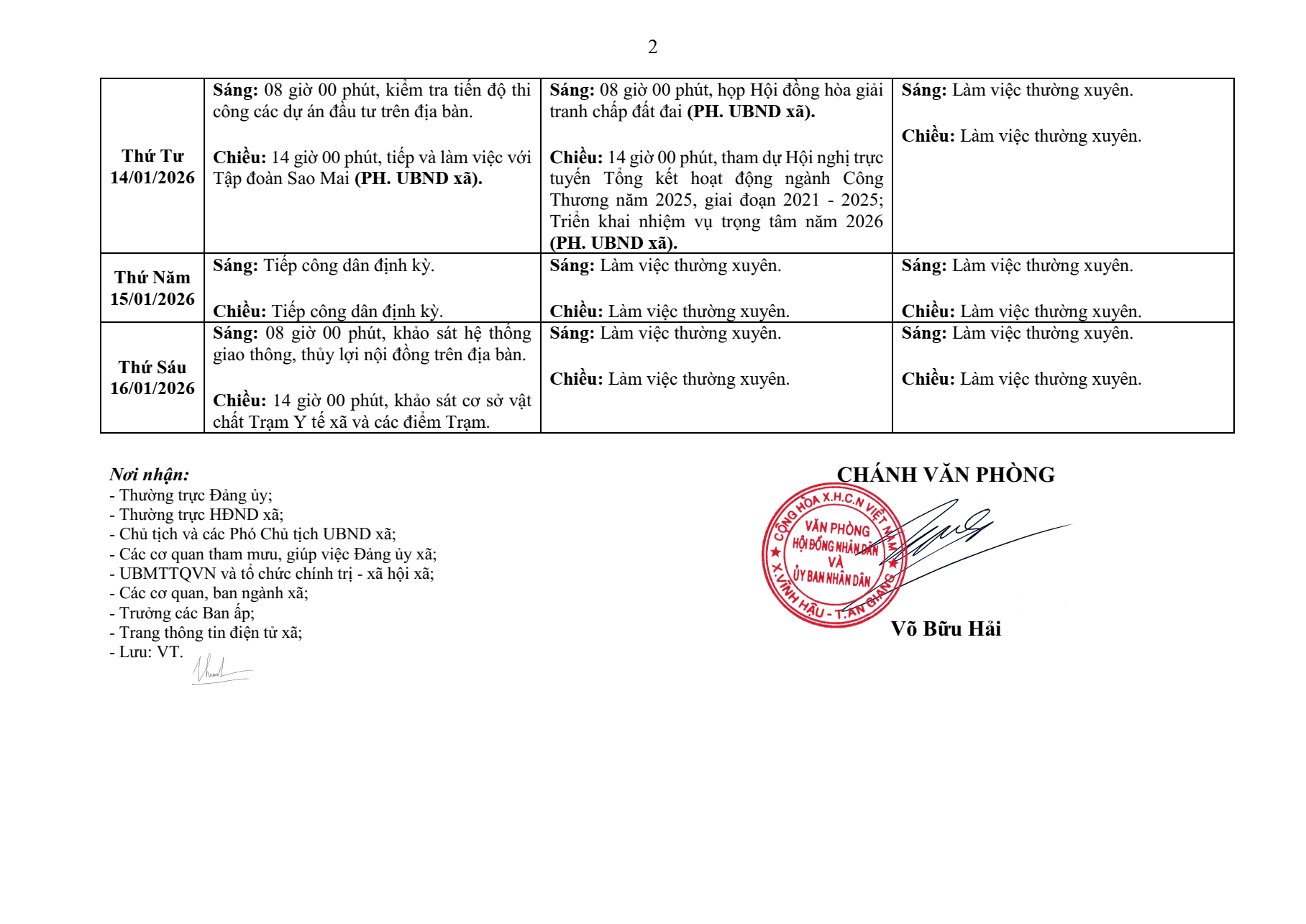 Lịch làm việc của UBND Lịch công tác tuần từ ngày 03/11 đến ngày 07/11/2025 13/01/2026 - aA + Submitted by Biên tập viên on 13 January 2026 Bài viết liên quan Lịch công tác tuần từ ngày 05/01/2026 đến ngày 10/01/2026 07/01/2026 Lịch công tác tuần (từ ngày 29/12/2025 đến ngày 02/01/2026) 01/01/2026 Lịch công tác tuần (từ ngày 22/12/2025 - ngày 26/12/2025) 23/12/2025 Lịch công tác tuần từ ngày 15/12 đến ngày 20/12/2025 18/12/2025 Lịch công tác tuần từ ngày 08/12 đến ngày 12/12/2025 10/12/2025 Thông báo về việc tiếp công dân định kỳ tháng 12 năm 2025 của đồng chí Bí thư Đảng ủy 03/12/2025