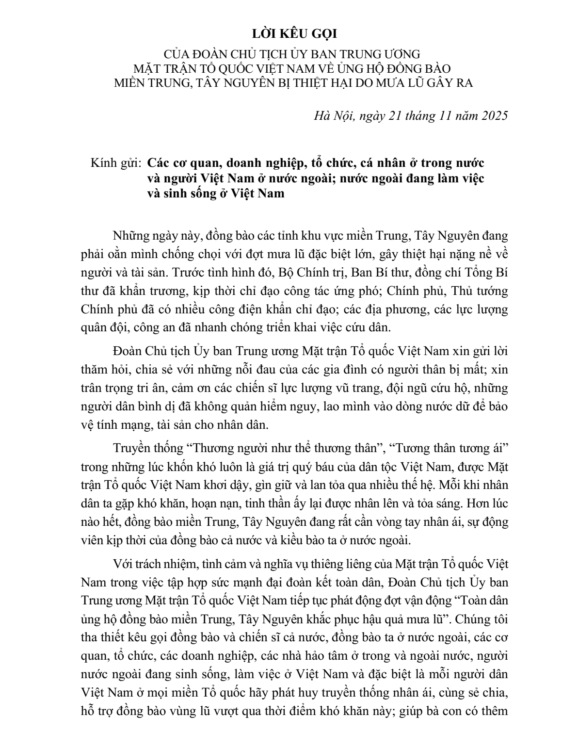 LỜI KÊU GỌI CỦA ĐOÀN CHỦ TỊCH ỦY BAN TRUNG ƯƠNG MẶT TRẬN TỔ QUỐC VIỆT NAM VỀ ỦNG HỘ ĐỒNG BÀO MIỀN TRUNG, TÂY NGUYÊN BỊ THIỆT HẠI DO MƯA LŨ GÂY RA