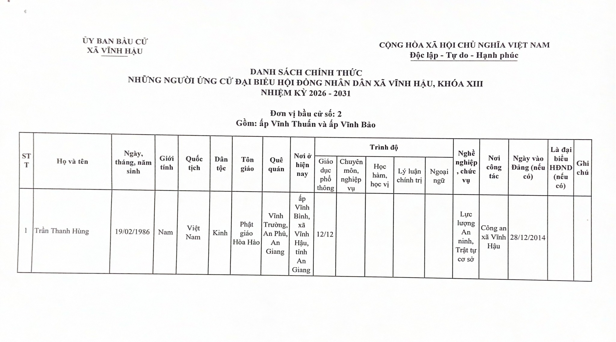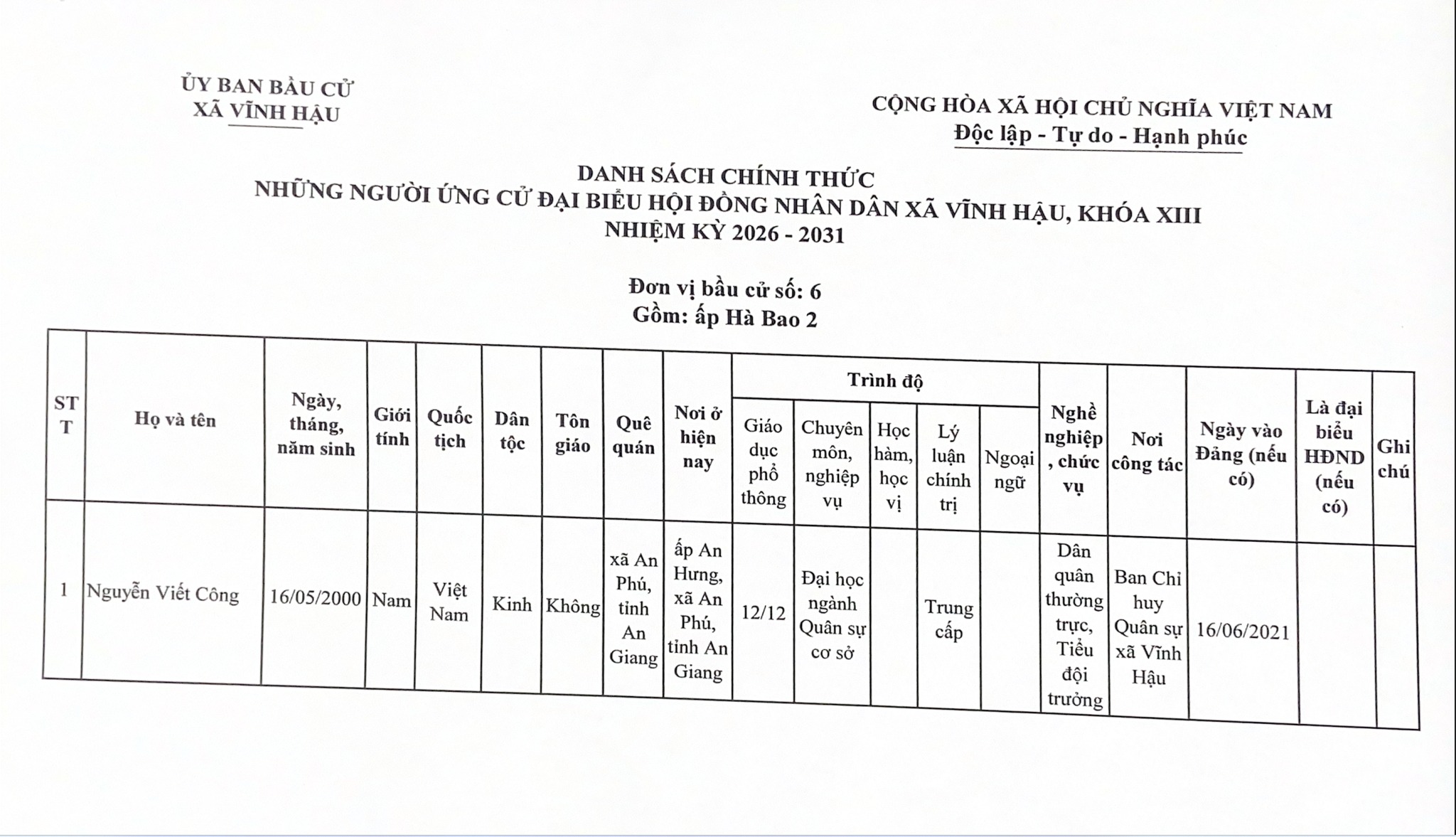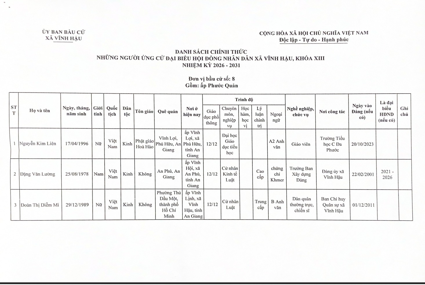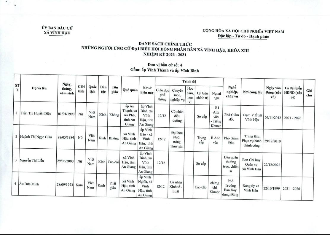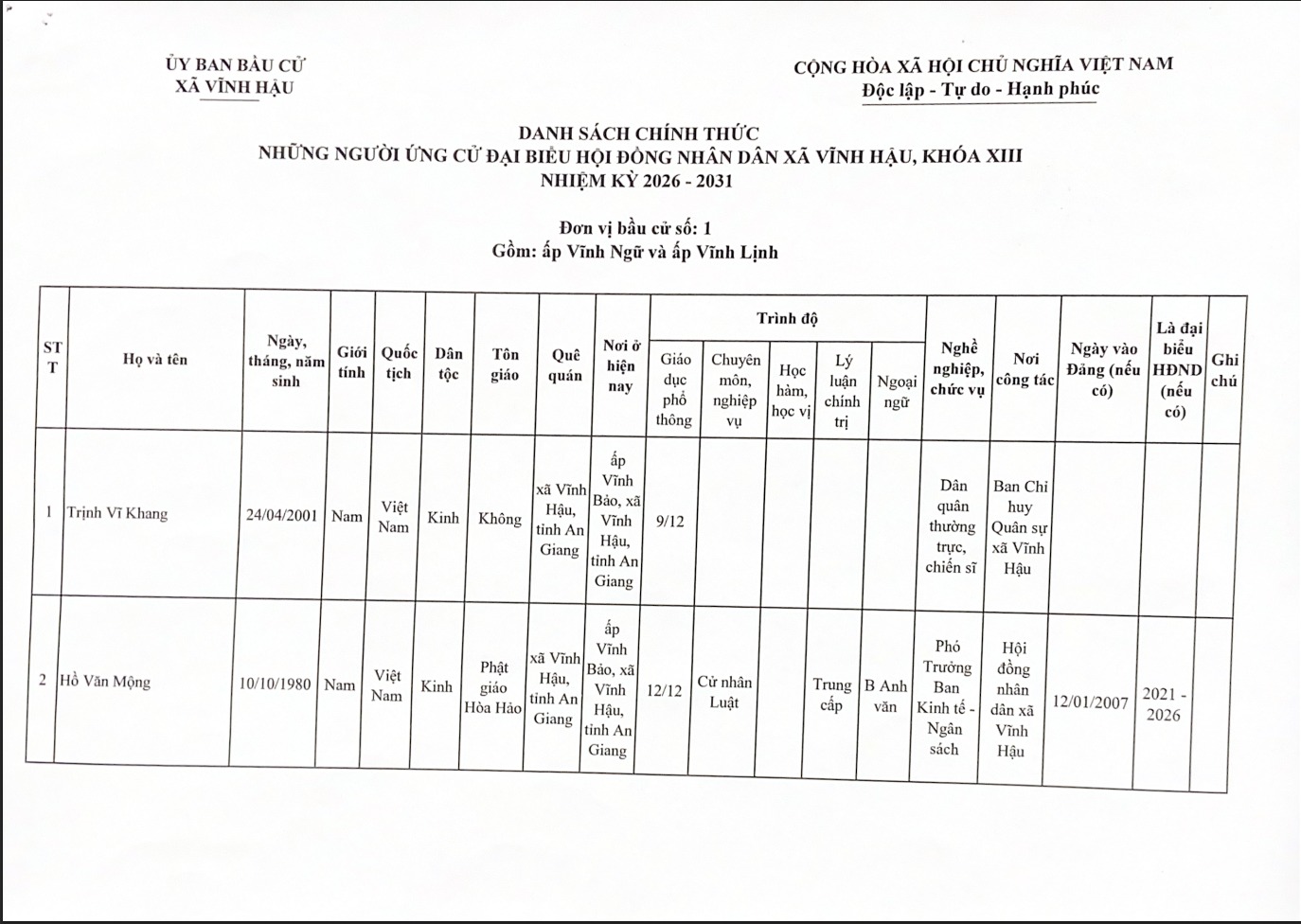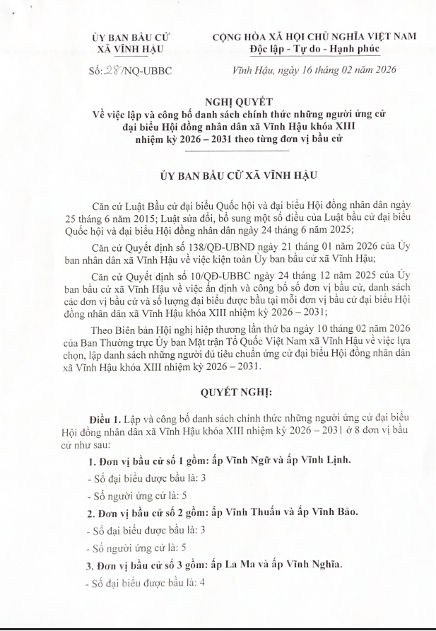 Nghị quyết lập và công bố danh sách chính thức những người ứng cử đại biểu HĐND xã Vĩnh Hậu khóa XIII nhiệm kỳ 2026 - 2031