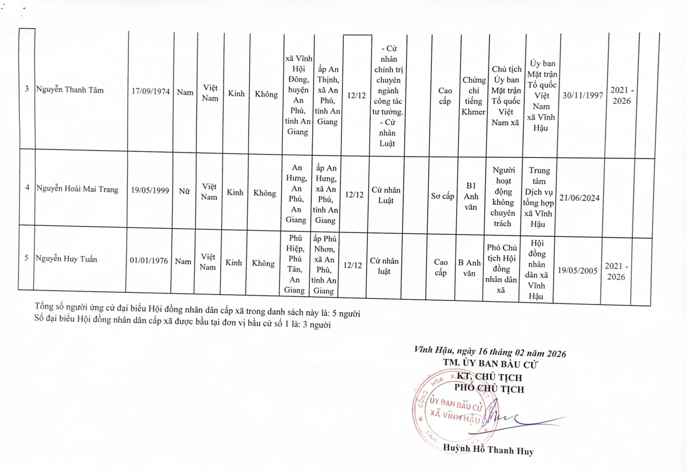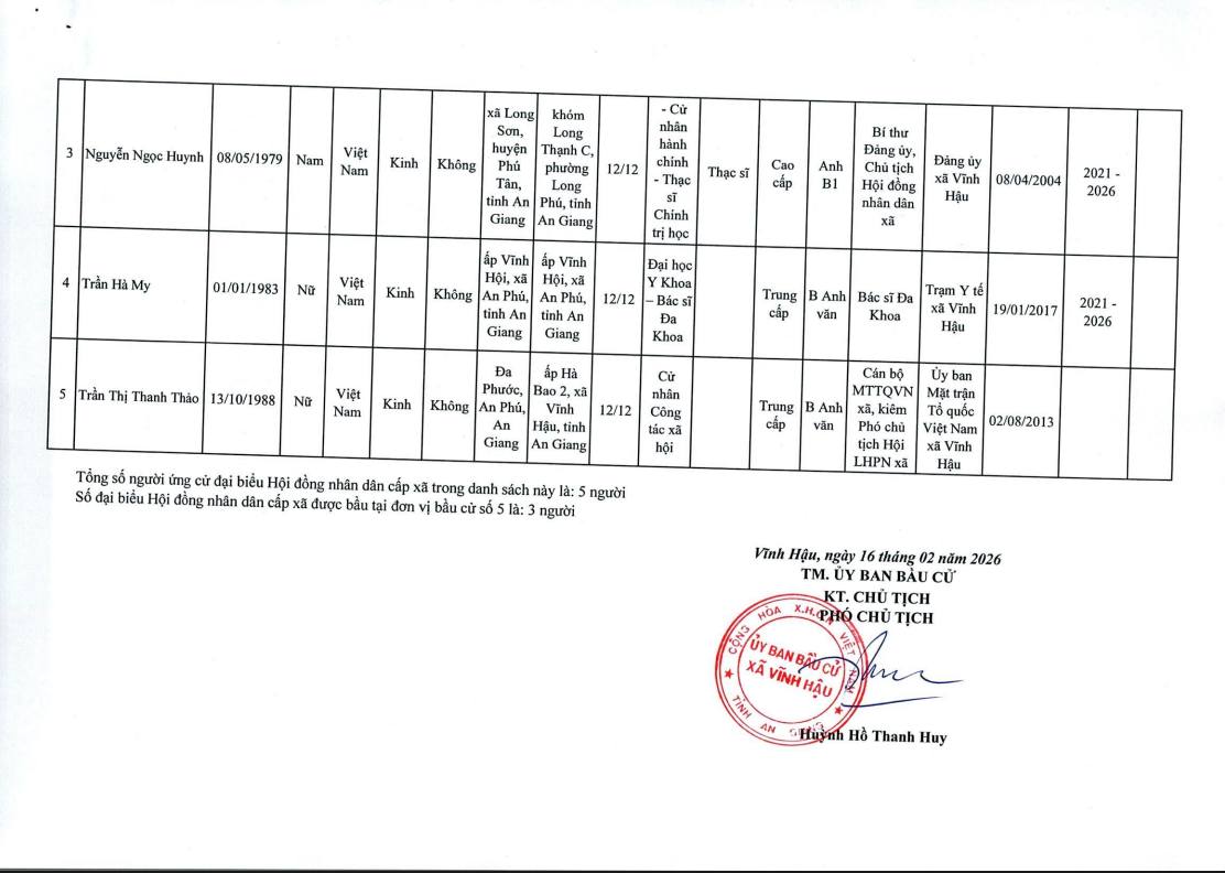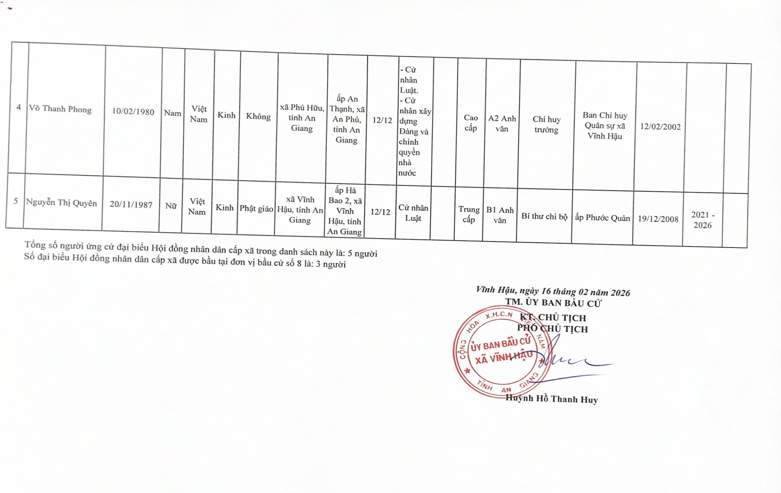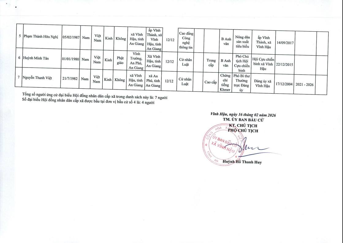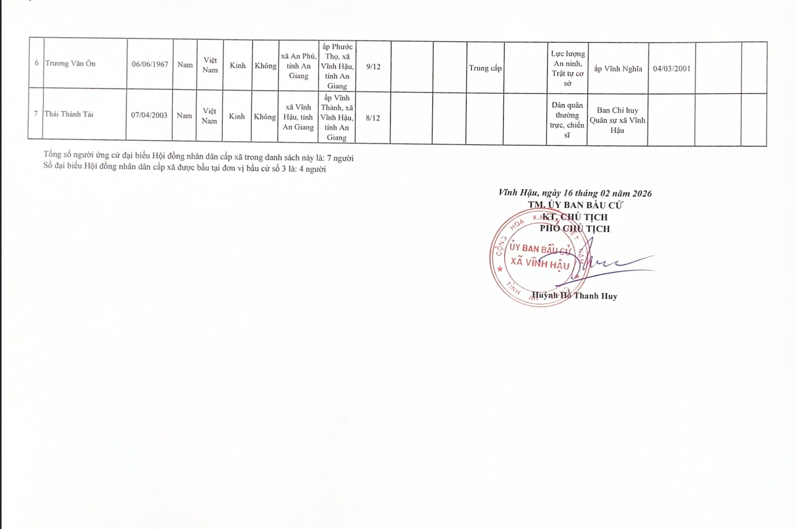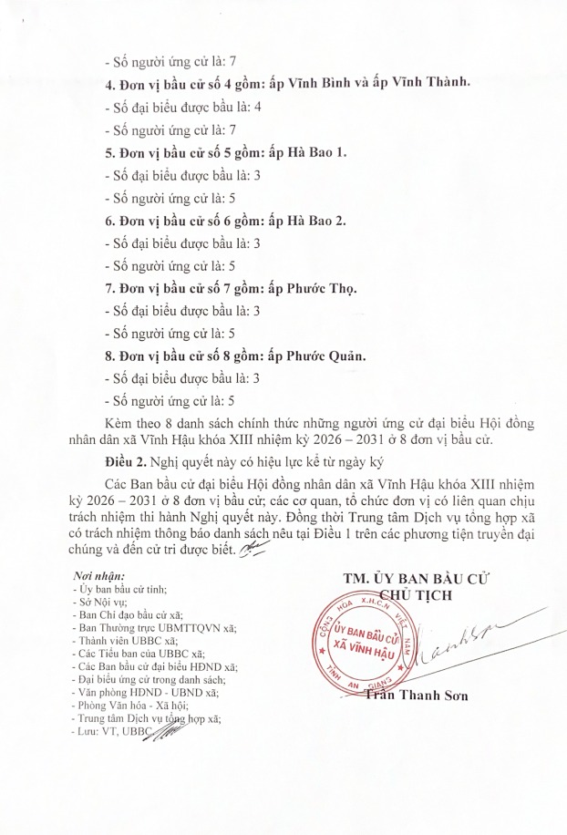 Nghị quyết lập và công bố danh sách chính thức những người ứng cử đại biểu HĐND xã Vĩnh Hậu khóa XIII nhiệm kỳ 2026 - 2031