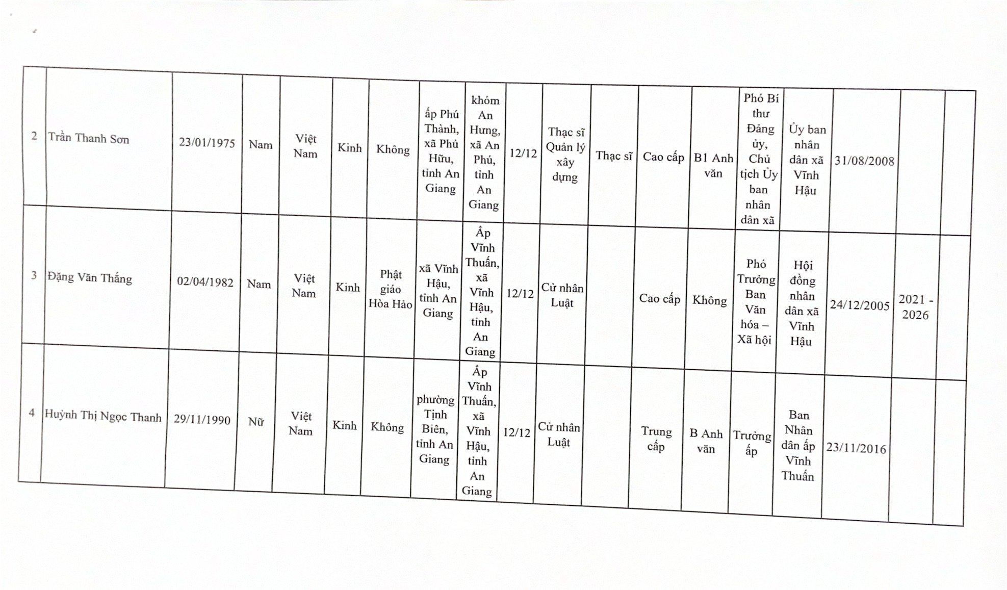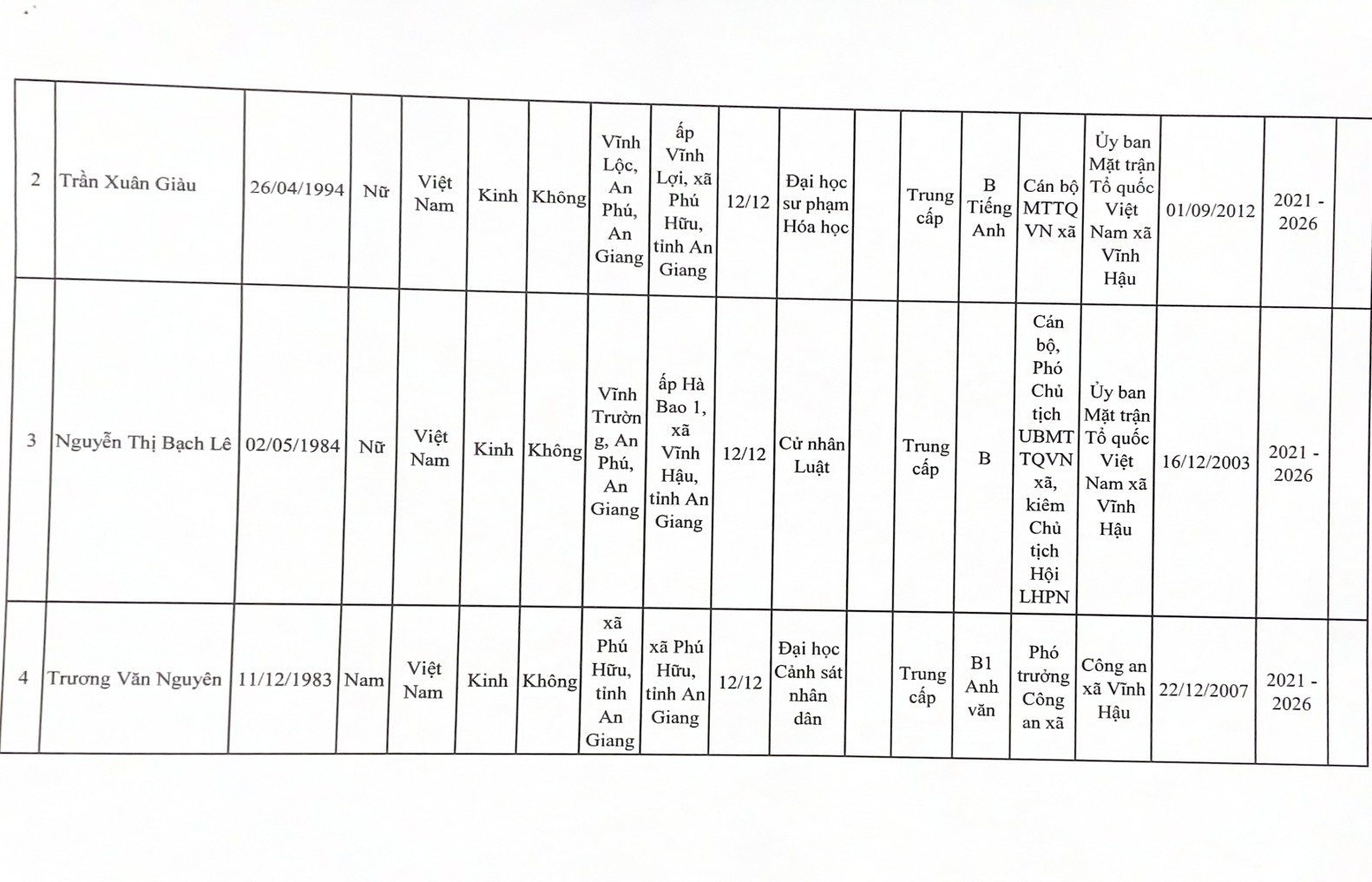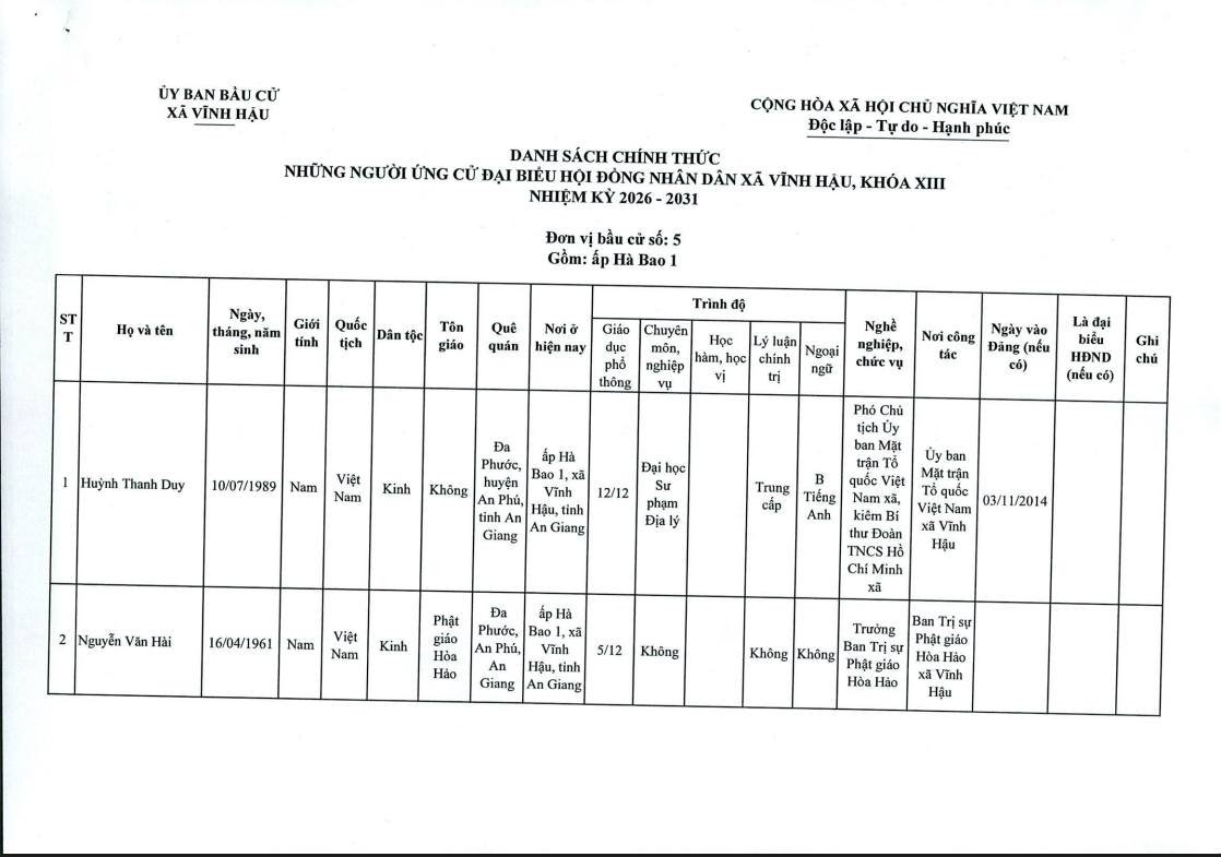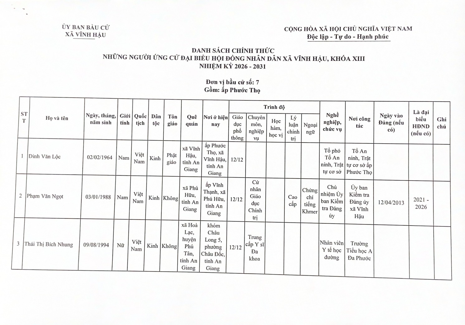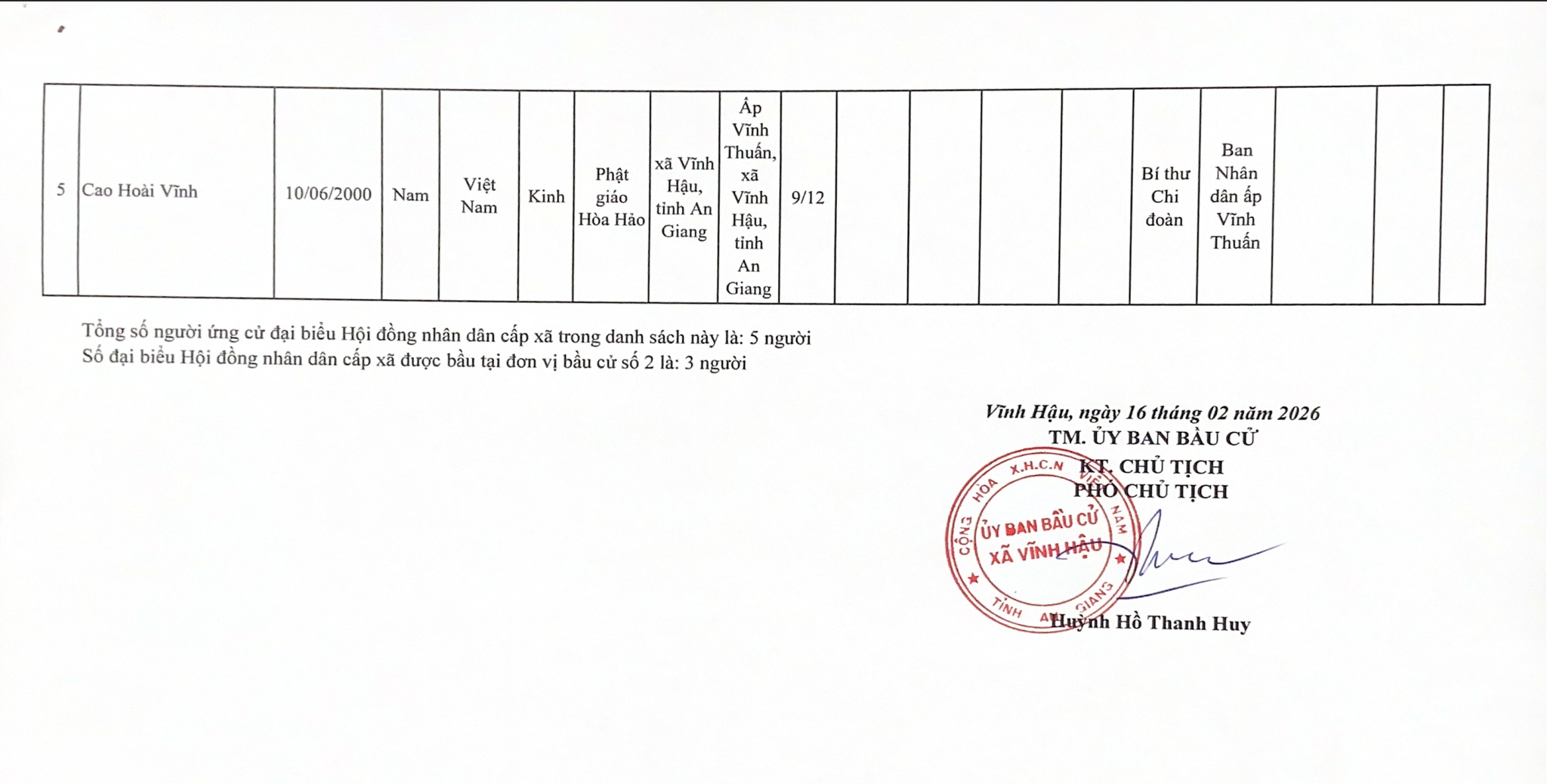 Nghị quyết lập và công bố danh sách chính thức những người ứng cử đại biểu HĐND xã Vĩnh Hậu khóa XIII nhiệm kỳ 2026 - 2031