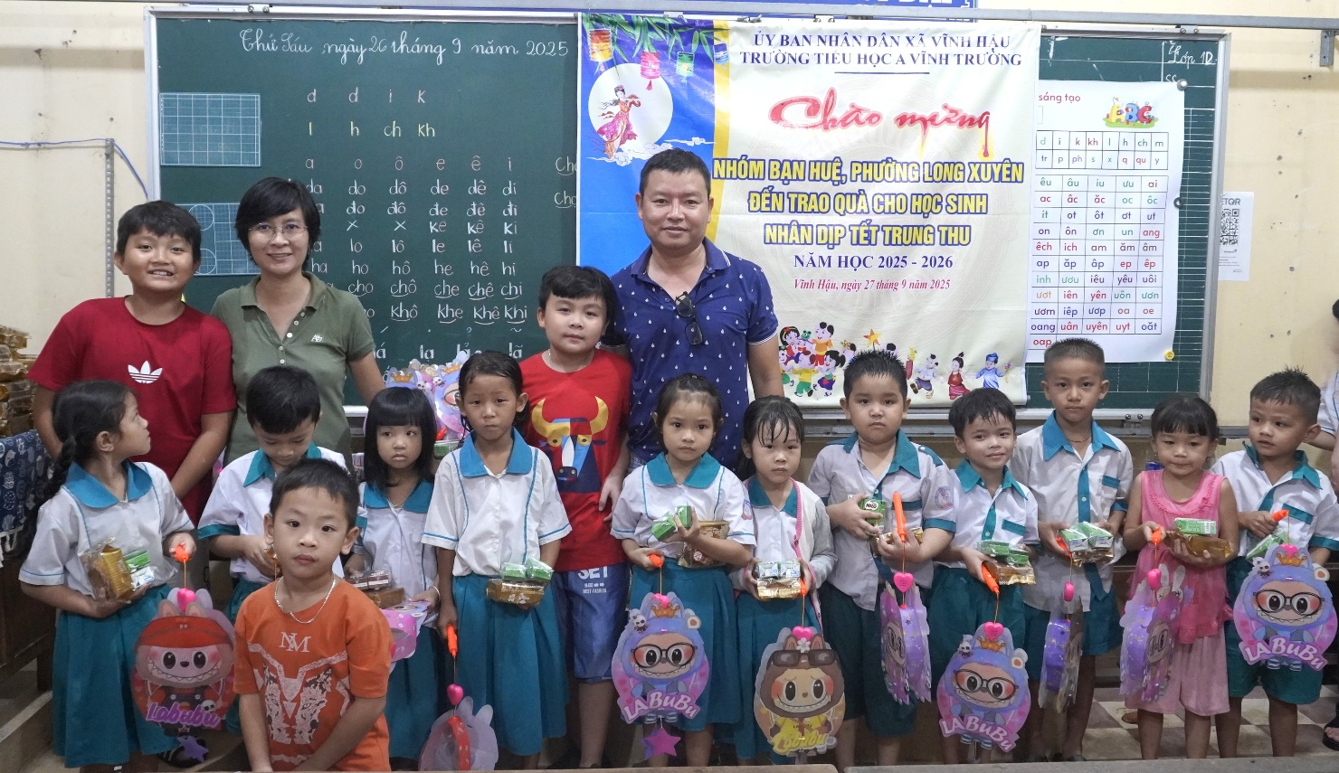 Ngày 27/9/2025, Nhóm thiện nguyện phường Long Xuyên trao tặng 200 suất quà Tết Trung thu cho học sinh trường Tiểu học A Vĩnh Trường - xã Vĩnh Hậu.