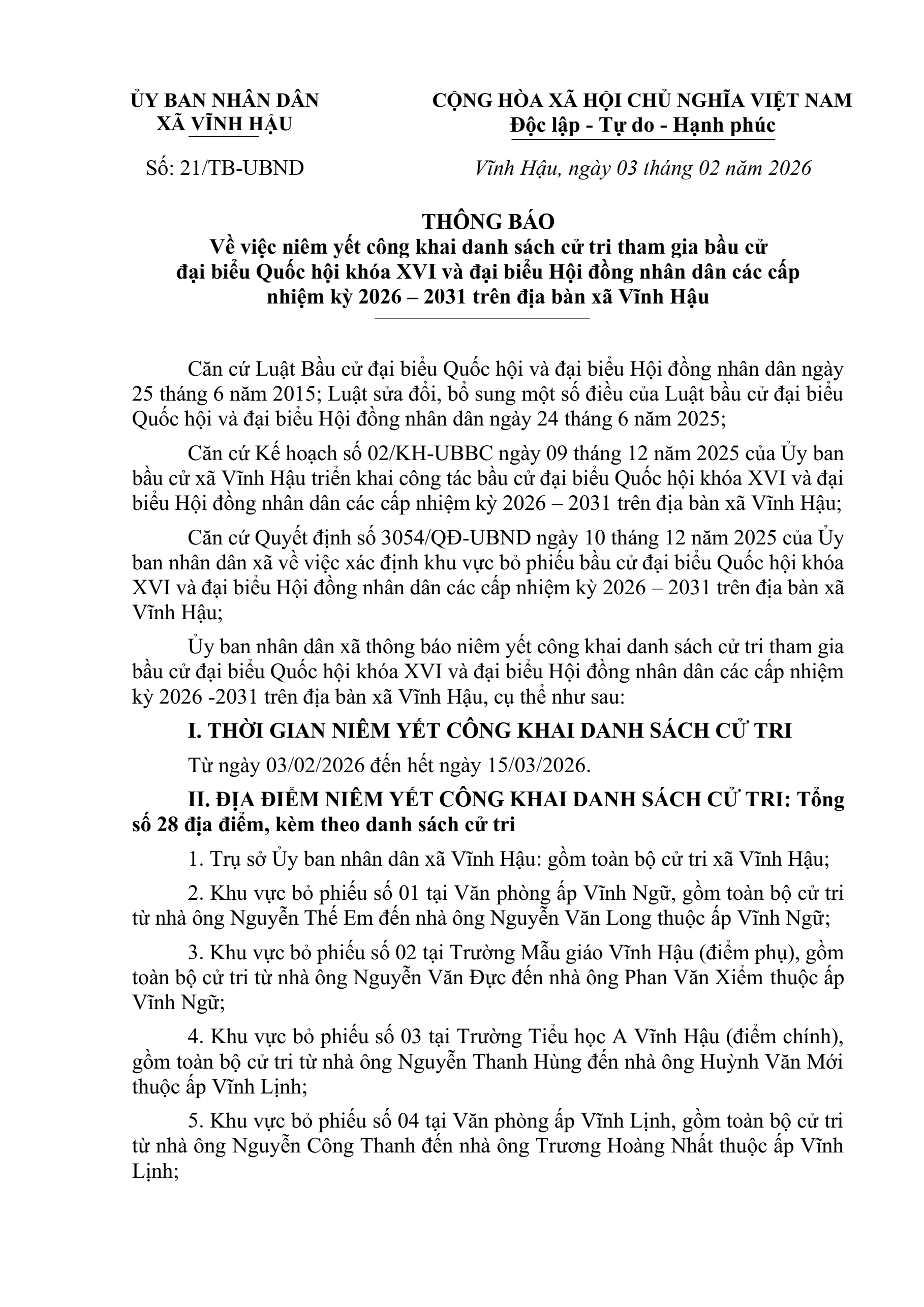 Thông báo niêm yết danh sách cử tri bầu cử đại biểu Quốc hội khóa XVI và đại biểu Hội đồng nhân dân các cấp nhiệm kỳ 2026-2031