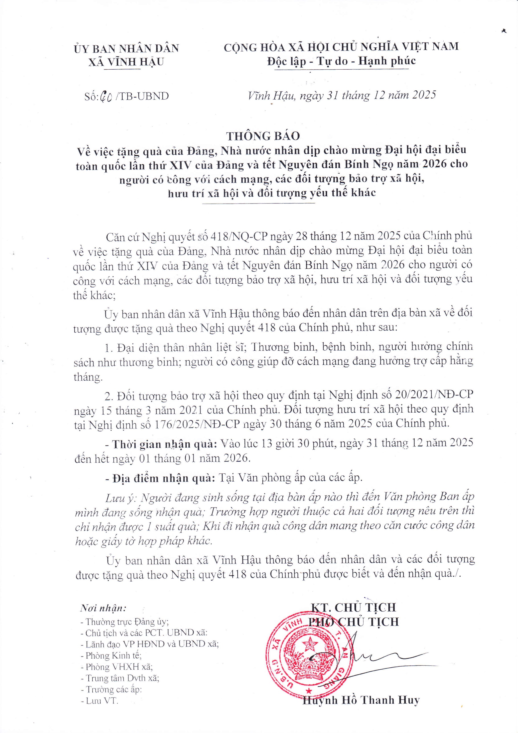 Thông báo thời gian tặng quà theo Nghị quyết số 418/NQ-CP ngày 28/12/2025 của Chính phủ