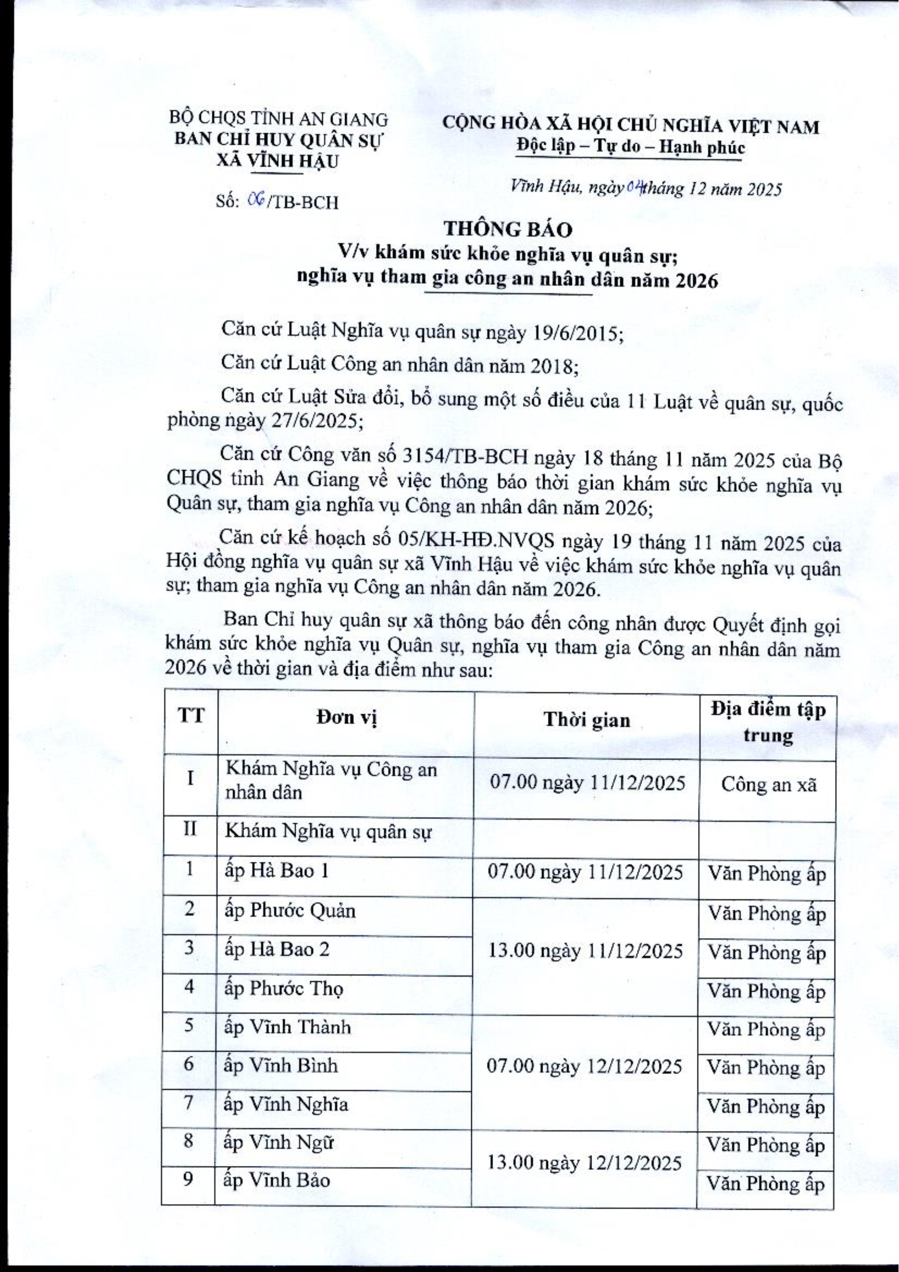 Thông báo về việc khám sức khỏe Nghĩa vụ Quân sự, Nghĩa vụ Công an nhân dân năm 2026