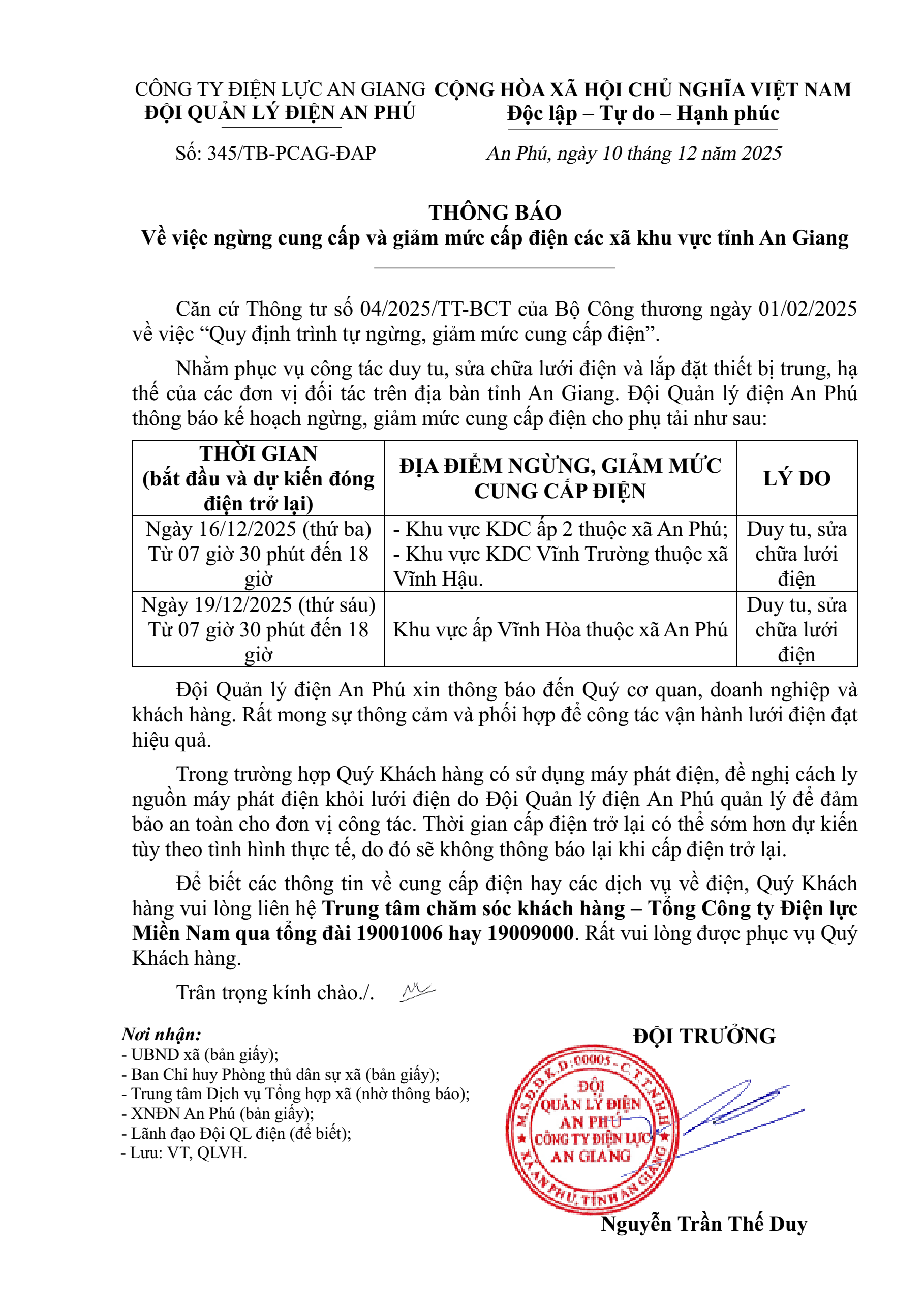 Thông báo về việc ngừng cung cấp và giảm mức cấp điện các xã khu vực tỉnh An Giang