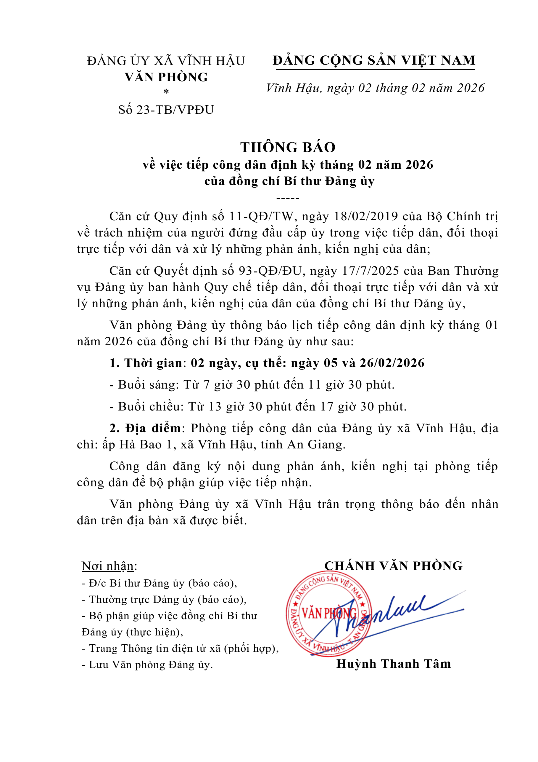 Thông báo về việc tiếp công dân định kỳ tháng 02 năm 2026 của đồng chí Bí thư Đảng ủy