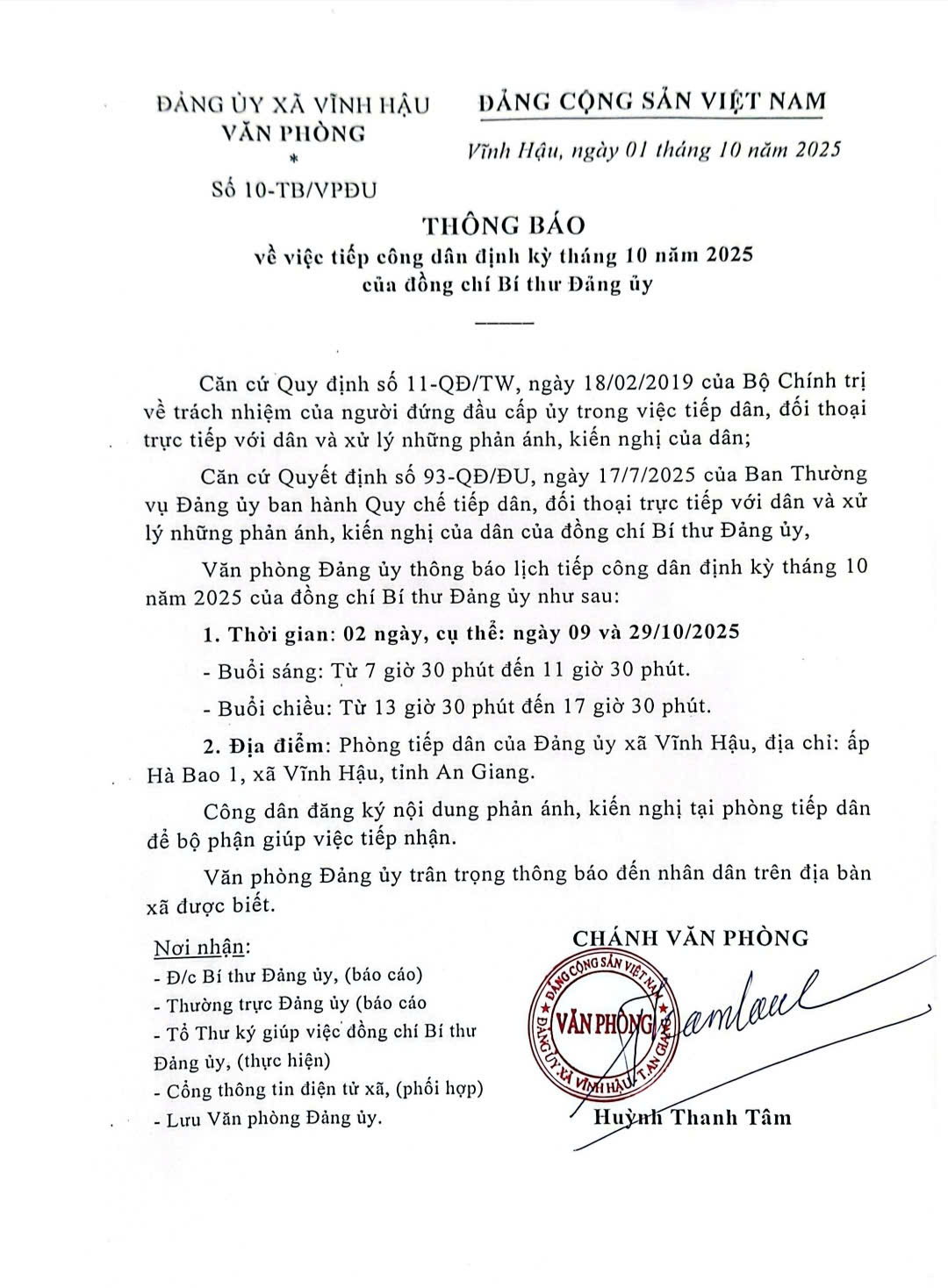 Lịch tiếp công dân Thông báo Thông báo về việc tiếp công dân định kỳ tháng 10 năm 2025 của đồng chí Bí thư Đảng ủy xã Vĩnh Hậu 01/10/2025 - aA + Submitted by Biên tập viên on 1 October 2025 Bài viết liên quan