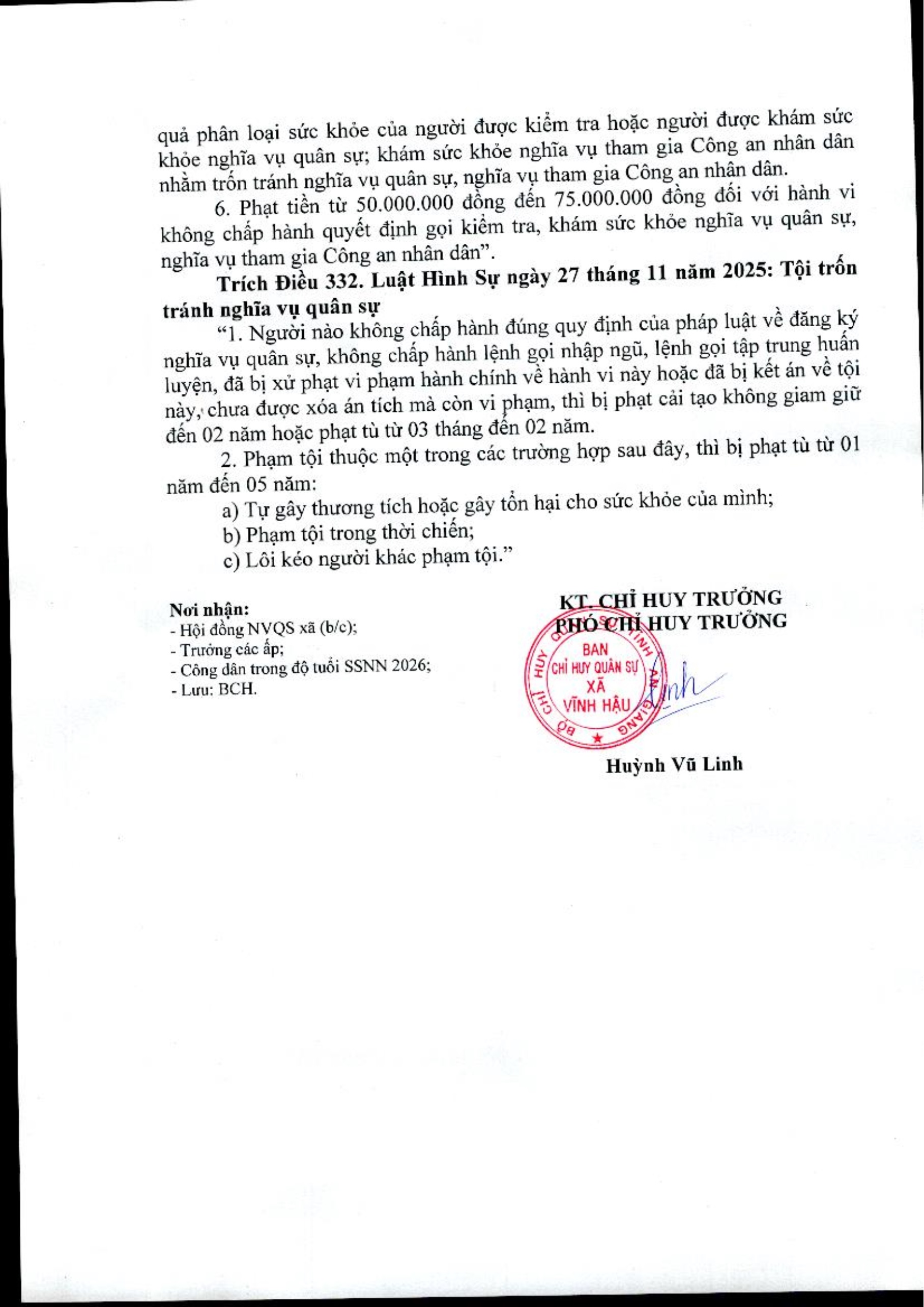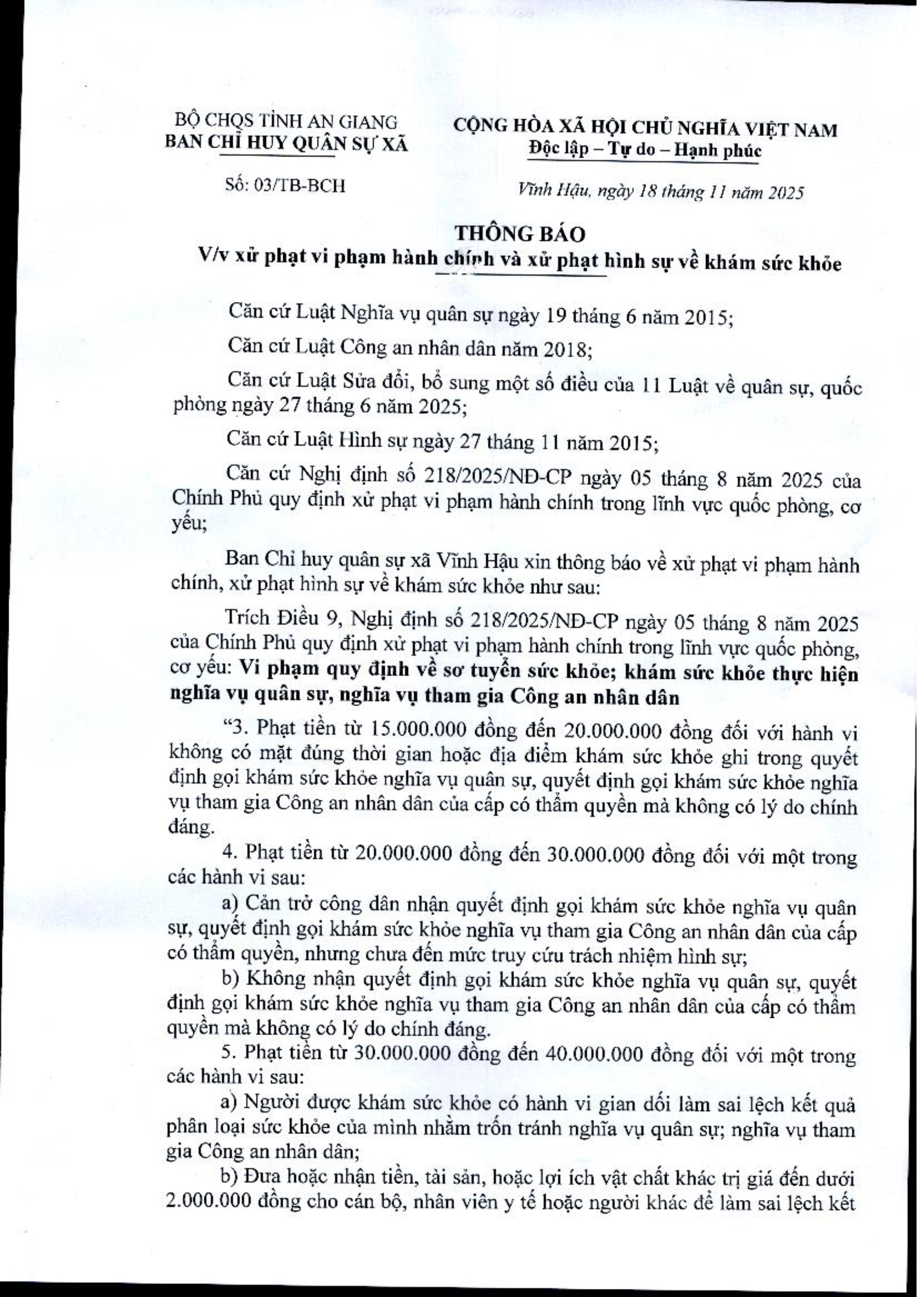 Thông báo về việc xử phạt vi phạm hành chính và xử phạt hình sự về khám sức khỏe Nghĩa vụ Quân sự, Nghĩa vụ Công an