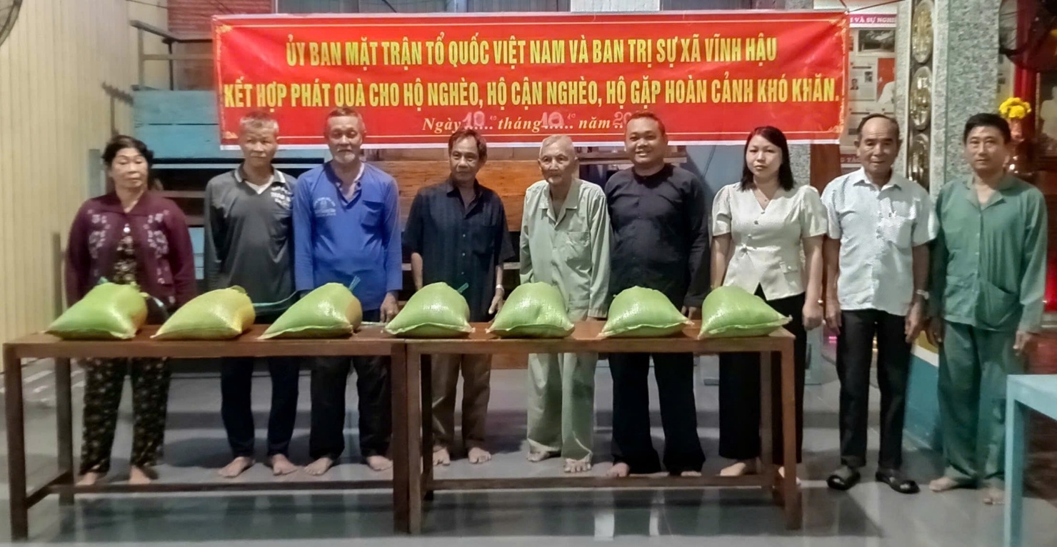 Nhằm chung tay góp sức vào hoạt động tương trợ, chia sẻ với người già neo đơn, người tàn tật, hộ gia đình có hoàn cảnh khó khăn, ngày 10/10/2025, Ủy ban Mặt trận Tổ quốc Việt Nam xã Vĩnh Hậu kết hợp cùng Ban Trị sự Phật giáo Hòa Hảo xã đã trao tặng 20 suất gạo cho người già neo đơn, người tàn tật, hộ gia đình có hoàn cảnh khó khăn trên địa bàn xã. Mỗi suất gồm 10kg gạo. Tổng trị giá khoảng 3 triệu đồng.