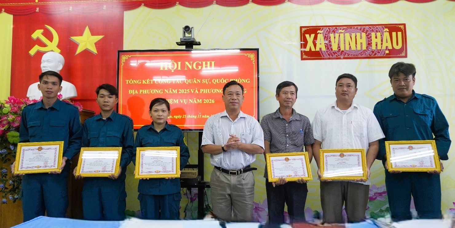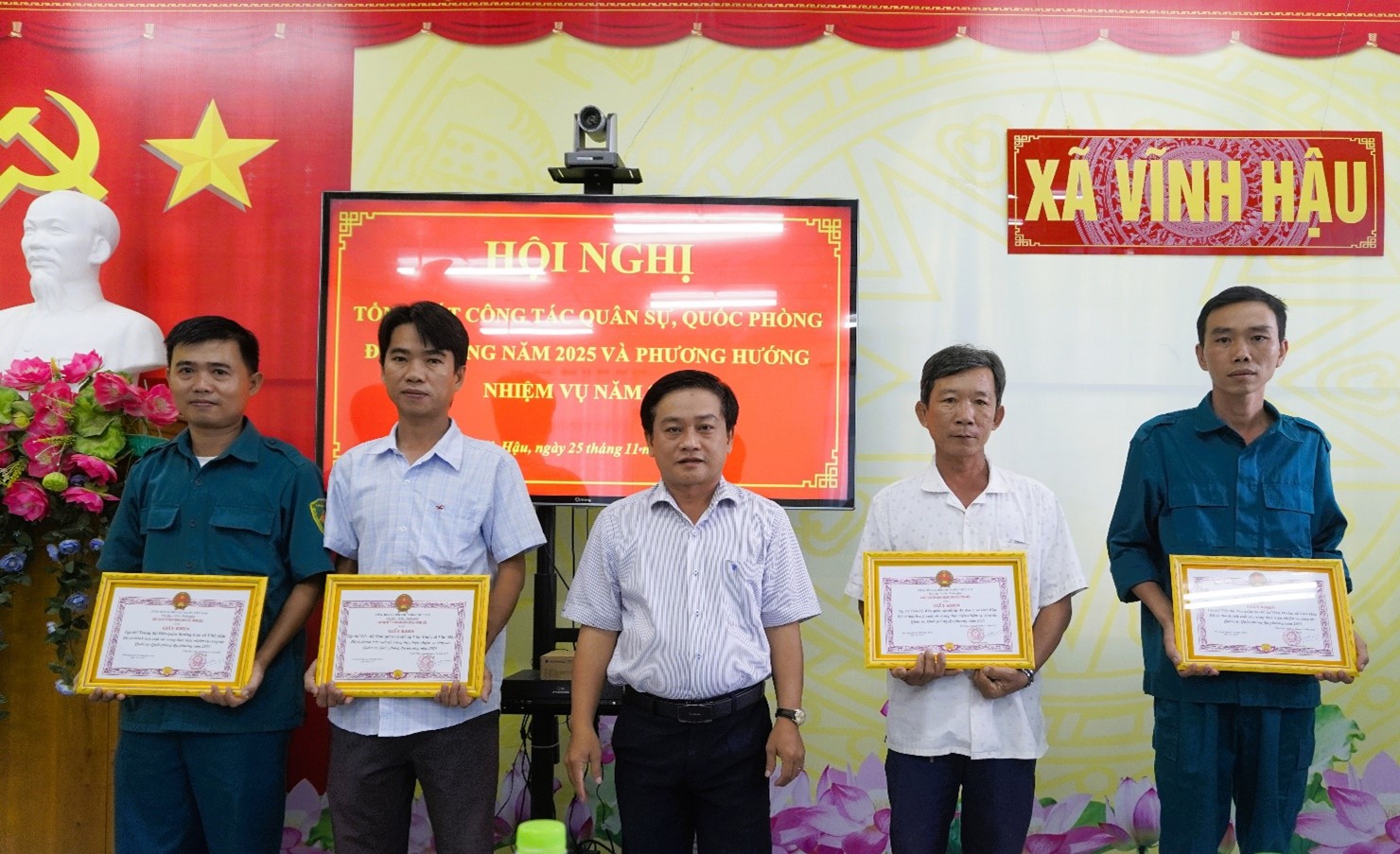 Nhân dịp này, Uỷ ban nhân dân xã Vĩnh Hậu đã khen thưởng cho 4 tập thể và 6 cá nhân có thành tích xuất sắc trong công tác Quân sự - Quốc phòng địa phương năm 2025.