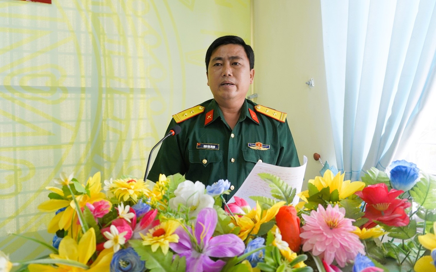 Trung tá Đinh Văn Nhanh, Phó Chỉ huy trưởng kiêm Tham mưu trưởng Ban Chỉ huy phòng thủ khu vực 1 - Long Phú phát biểu tại Hội nghị