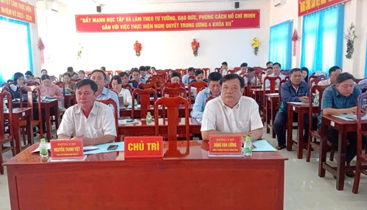 Đồng chí Nguyễn Thanh Việt, Phó Bí thư Thường trực Đảng ủy xã (ngồi bìa trái) và đồng chí Đặng Văn Lường, Trưởng Ban Xây dựng Đảng (ngồi bìa phải) tham dự Hội nghị