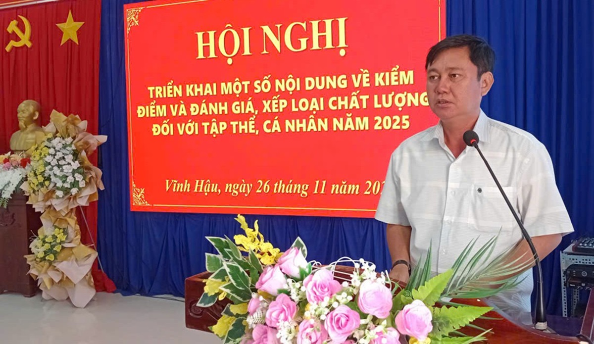 Sáng 26/11/2025, Đảng ủy xã Vĩnh Hậu tổ chức Hội nghị triển khai một số nội dung về kiểm điểm và đánh giá, xếp loại chất lượng đối với tập thể, cá nhân năm 2025. Đồng chí Nguyễn Thanh Việt, Phó Bí thư Thường trực Đảng ủy xã dự và chủ trì hội nghị.