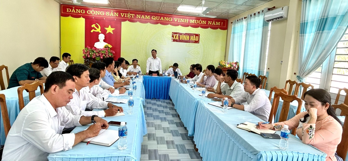 Sáng ngày 15/9/2025, UBND xã Vĩnh Hậu tổ chức cuộc họp giao ban đánh giá kết quả thực hiện nhiệm vụ trong tuần vừa qua và triển khai nhiệm vụ cho tuần kế tiếp của các cơ quan, đơn vị. Ông Trần Thanh Sơn - Phó Bí thư Đảng ủy, Chủ tịch UBND xã chủ trì cuộc họp. Tham dự còn có: Ông Huỳnh Hồ Thanh Huy - Phó Chủ tịch UBND xã; Ông Phạm Tấn Thời - Phó Chủ tịch UBND xã.