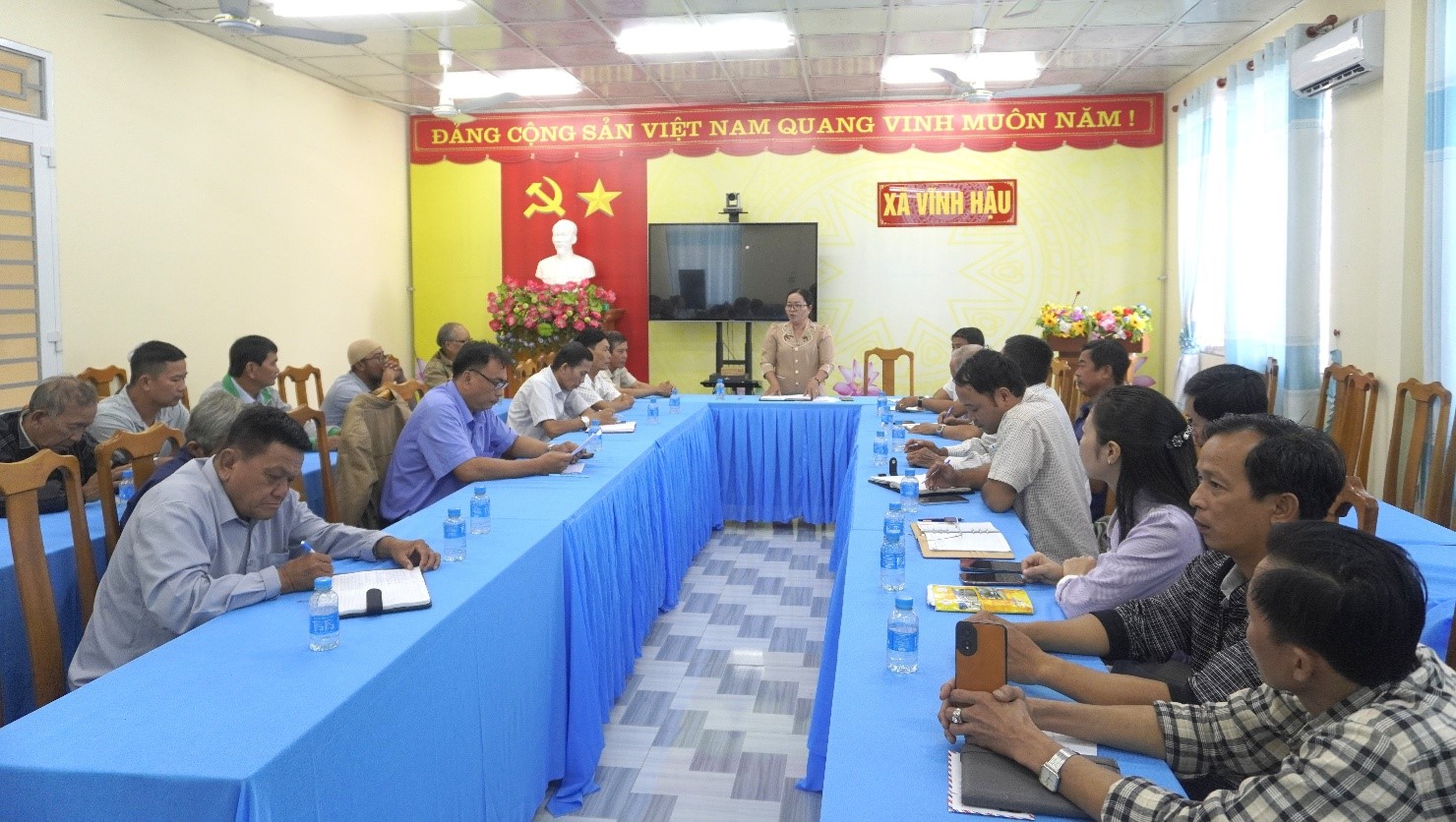Ngày 26/11/2025, Ủy ban nhân dân xã Vĩnh Hậu tổ chức cuộc họp triển khai việc xây dựng kế hoạch xả lũ vụ Thu Đông đối với các tiểu vùng sản xuất 3 vụ giai đoạn 2026 – 2030. Tham dự cuộc họp có bà Nguyễn Thị Nhanh, Trưởng Phòng Kinh tế xã, chủ trì, cùng Trưởng các Ban ấp và các nông dân trên địa bàn xã.