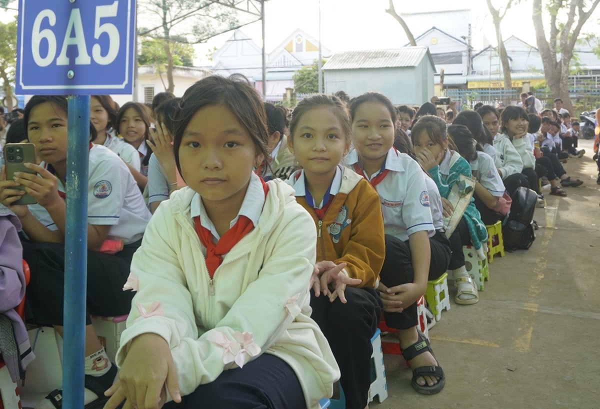 Các em học sinh Trường Trung học cơ sở Đa Phước dự buổi họp mặt chào mừng kỷ niệm 43 năm Ngày Nhà giáo Việt Nam