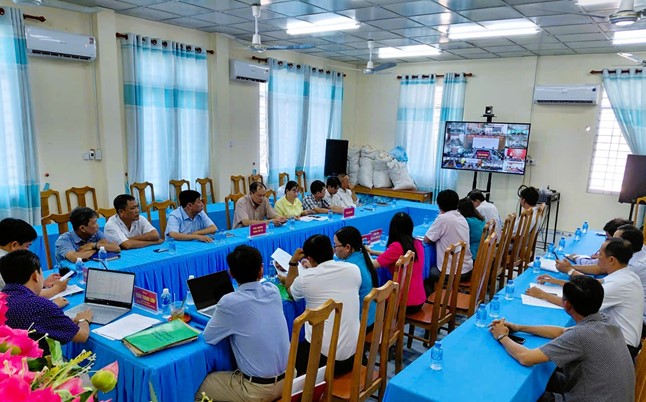 Đồng chí Nguyễn Ngọc Huynh, Bí thư Đảng ủy; Chủ tịch Hội đồng nhân dân xã ( ngồi bìa phải); đồng chí Trần Thanh Sơn, Phó Bí thư Đảng ủy, Chủ tịch Ủy ban nhân dân xã ( ngồi bìa trái) tham dự cuộc họp tại điểm cầu xã Vĩnh Hậu