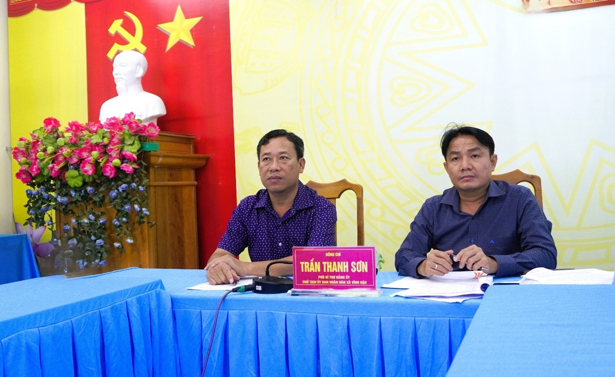 Ông Trần Thanh Sơn, Phó Bí thư Đảng ủy, Chủ tịch Ủy ban nhân dân xã (ngồi bìa trái) chủ trì tại điểm cầu xã Vĩnh Hậu.
