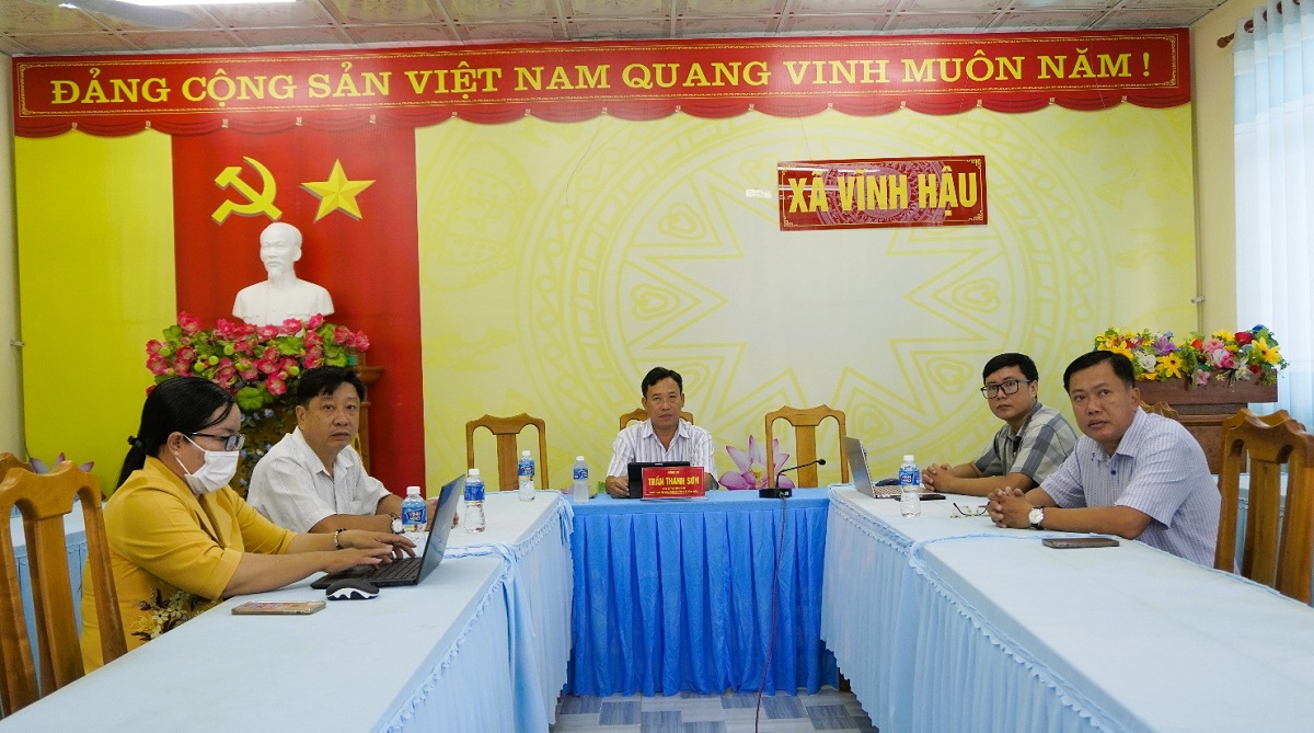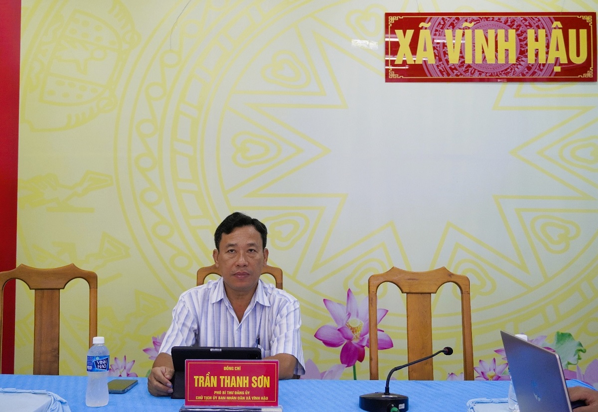 Đồng chí Trần Thanh Sơn, Phó Bí thư Đảng ủy, Chủ tịch Ủy ban nhân dân xã chủ trì hội nghị tại điểm cầu xã Vĩnh Hậu.