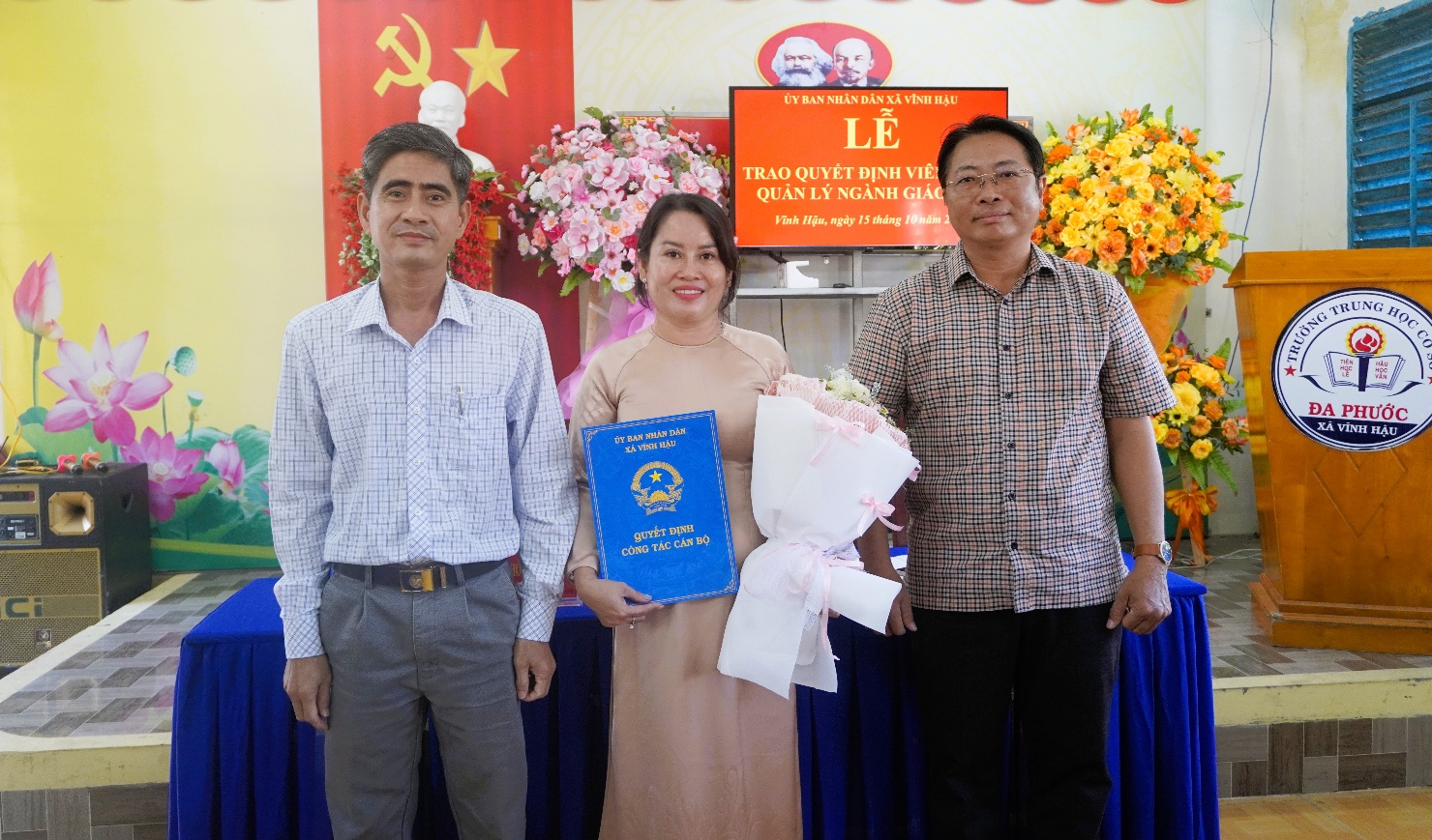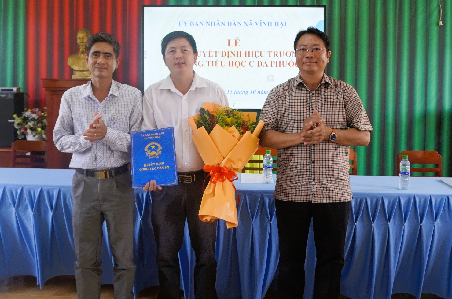 Chiều ngày 15/10/2025, Ủy ban nhân dân xã Vĩnh Hậu tổ chức Lễ trao Quyết định bổ nhiệm Hiệu trưởng trường Tiểu học C Đa Phước và Hiệu trưởng trường Trung học cơ sở Đa Phước.